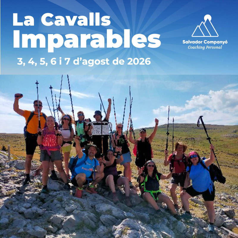 Així que et presento una EXPERIÈNCIA transformadora de veritat. Una experiència MEMORABLE en què et tornaràs IMPARABLE. Tant real com la vida mateixa. Unim en una mateixa experiència Desenvolupament Personal, Activitat Física i Natura -un recés en moviment- per desfer-te de l’angoixa, alliberar-te de les pors i buidar la ira i el ressentiment, per accedir a un estat intern òptim, ple de recursos, on connectes amb la teva essència i despertes habilitats i capacitats, el poder intern i el propòsit que marcarà el teu esdevenir. En un marc incomparable… no hi ha altra opció possible. És Sí o Sí, és Ara o Ara, connectaràs amb tu mateix, sabràs el que necessites i despertaràs la vitalitat per assolir-ho.